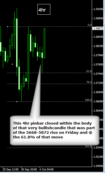 I think your cable trading today has been at best niaive...On a day that since 0838am this London morning has seen cable pretty much rise and keep rising, was it not better to find areas at which you could buy ? I say this not because I am being a retrospective smart **** but beacuse since the 1hr and 4hr pinbars that formed at the 61.8% 5668-5872 @ the current daily lo 5746, the price action has been bullish and the oscillators have been pointing north etc....It just seems like top picking in a clear intraday bullish market?