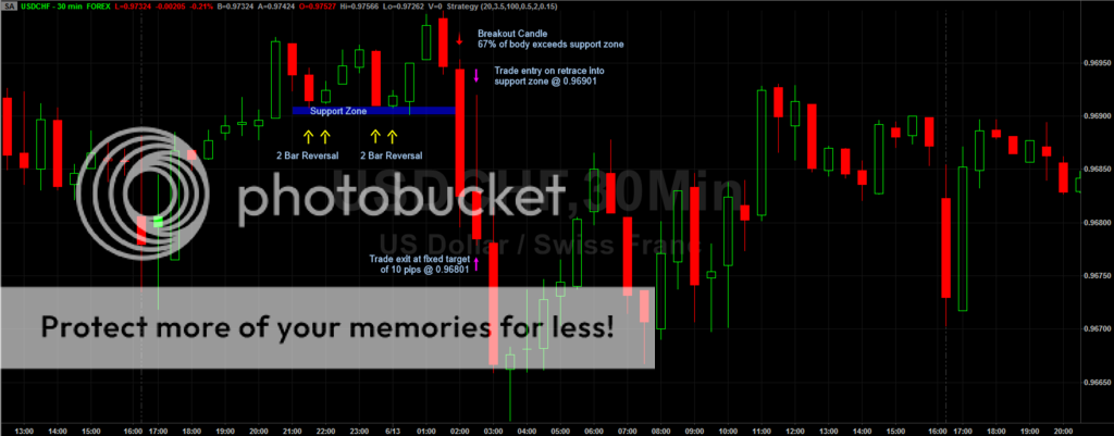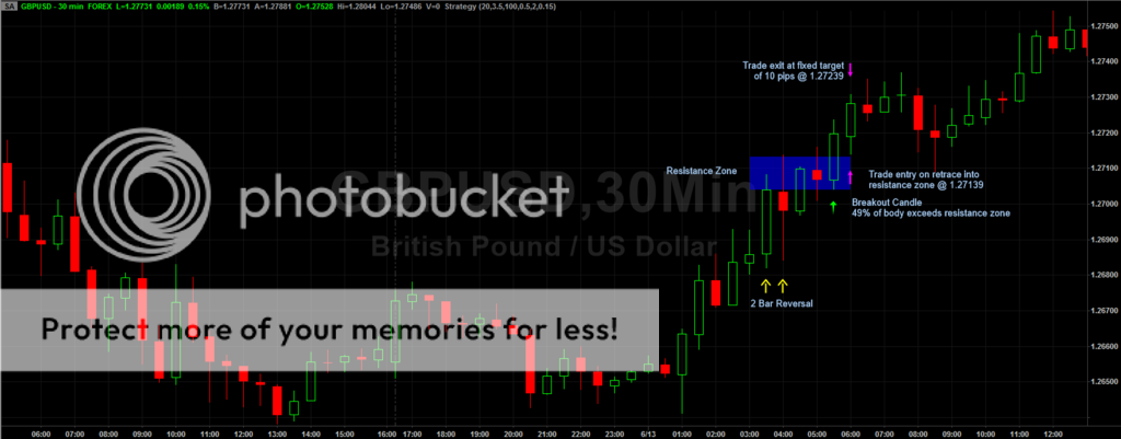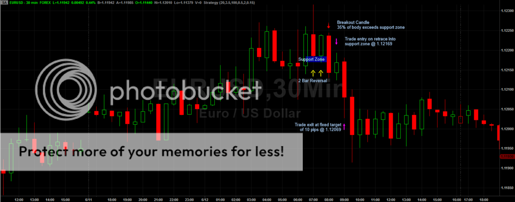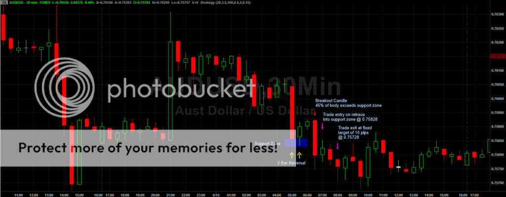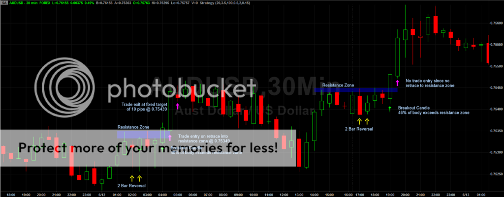 Also, I am a little fuzzy on how you are defining your support/resistance zones. I think you are defining it as the shadows of the 2 bar reversal, but in the first chart you posted it appears you are using more than this to define the zone. For that one I believe a valid entry signal would be generated, but the price would not retrace back into the zone so the trade wouldn't have been taken. A little more clarity on this would be appreciated.