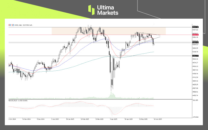 The EU50 index has broken below a key ascending wedge structure, signaling a potential bearish reversal. The breakdown comes after multiple failed attempts to breach the upper resistance zone near 5430–5450, which aligns with the upper bound of the multi-month consolidation range.