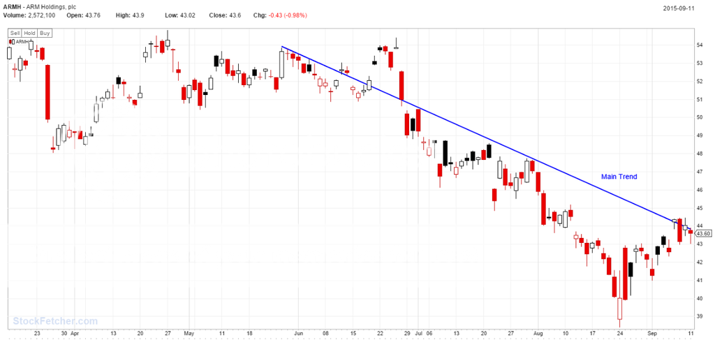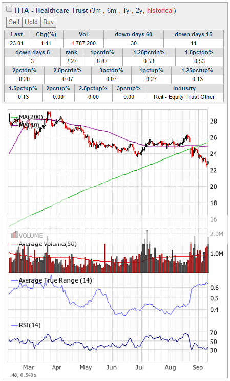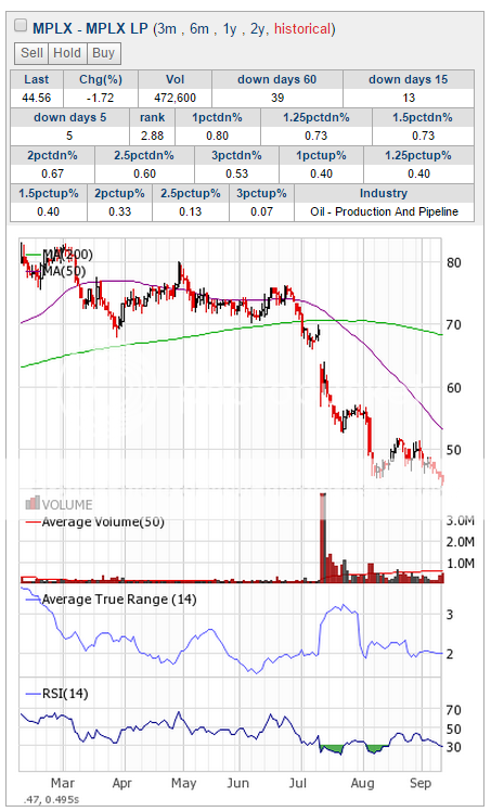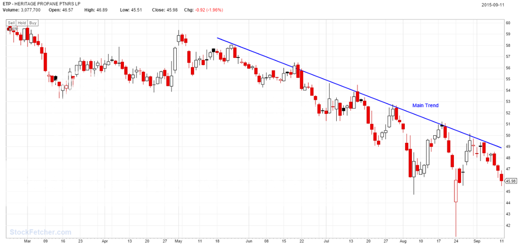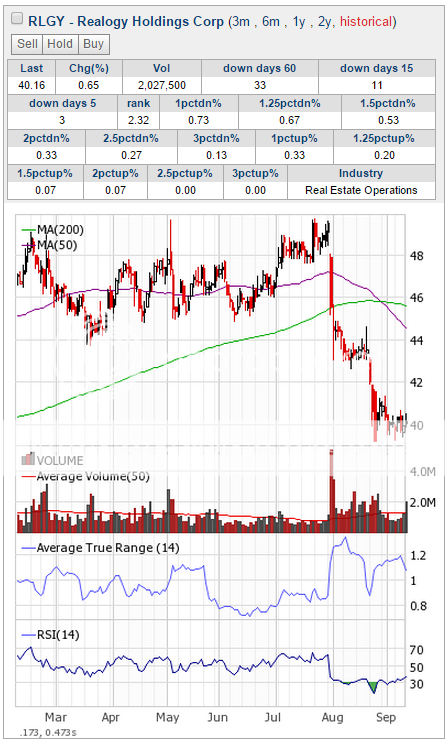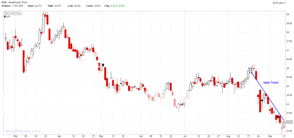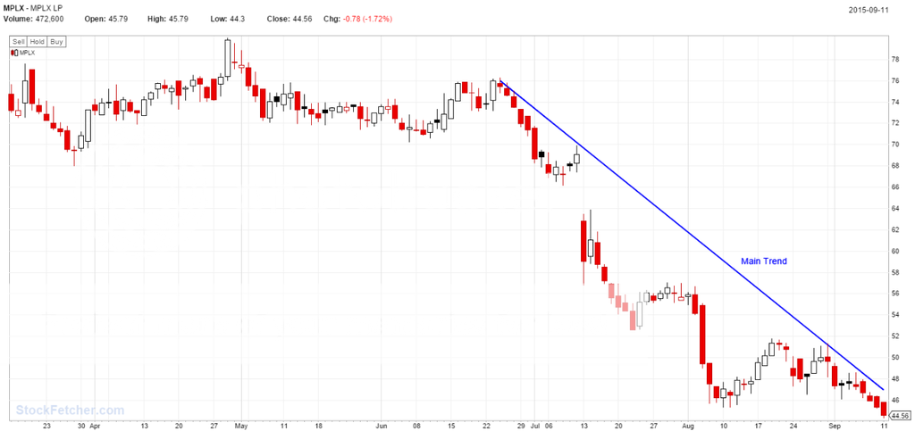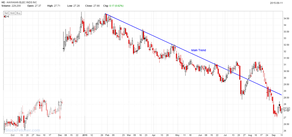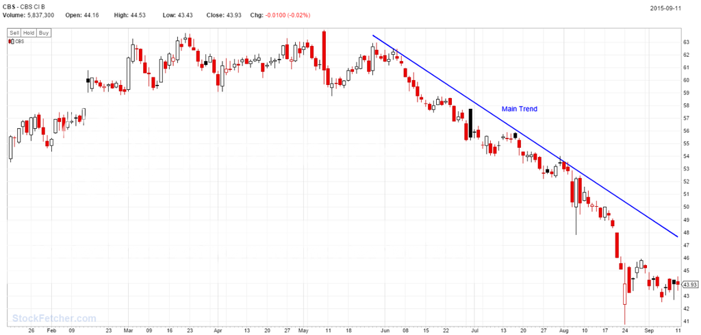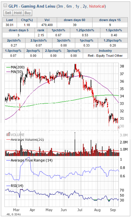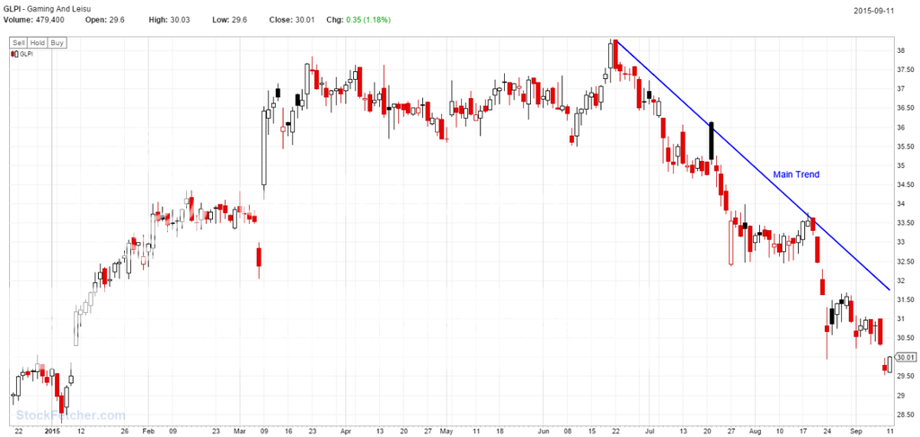 The stock has been trading sideways (but nearly always a down day) for a little bit now, but it is approaching the main down trend again. The trend of the sector is down as well.