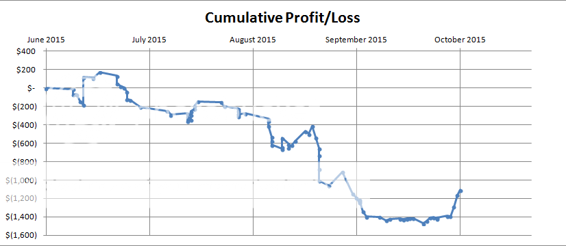 However, the hard targets I set are not completely arbitrary. The way they are derived comes from the immediate (15 day prior) price trend. This is a system based on momentum so the underlying theory is that the price action will continue to act in a similar fashion in the immediate future (i.e. the following day). It is possible that 15 days is still to large of a window to look at for a short term strategy...or simply possible that there is no edge to be found from looking at it in this way. Time will tell.