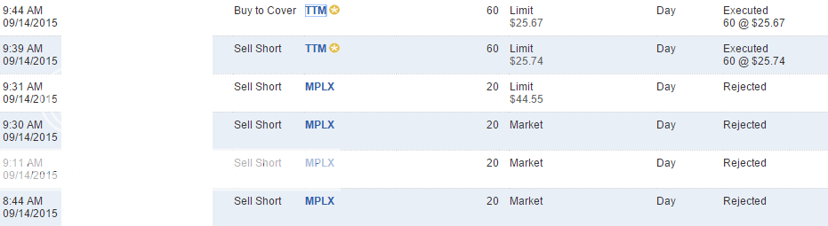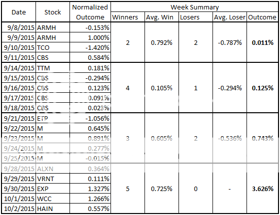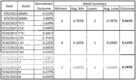 This is doable and something I will keep an eye on for future trades. Not going to incorporate it quite yet, but I have been thinking along these lines as well. I am also considering doing one short and one long play each day to hedge my risk somewhat in the event of a major good (or bad) news event that impacts all stocks. Some things to consider going forward, but not going to act on them yet.