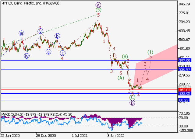 If the assumption is correct, an upward correction has started to develop as the wave B of (4), and the price of the asset will grow to the levels of 219.20–226.95. In this scenario, critical stop loss level is 185.70.