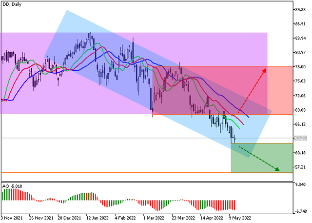 The index quotes form a global downward channel, reaching the support line. Technical indicators are in the state of a stable sell signal: indicator Alligator's EMA fluctuations range expands downwards, and the histogram of the AO oscillator trades in the sell zone, forming down bars.