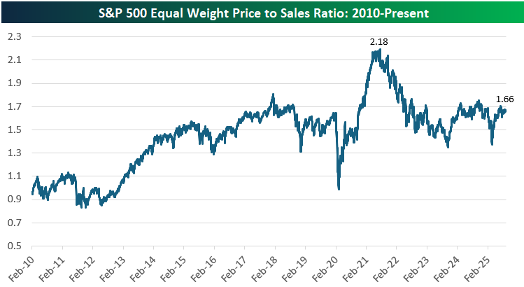 [td]But there's also a catch... The equal-weighted version of the S&P 500 tells a different story, with its price-to-sales ratio currently sitting at 1.66, well below its 2021 peak of 2.18. This highlights the outsized role that mega-cap stocks have played in driving overall index valuations higher, as the typical stock trades at a much more modest multiple of sales compared to the market-cap-weighted index. While still elevated relative to the early 2010s, the equal-weight P/S ratio is right in the middle of its 12-year range. While valuation excesses are concentrated in the largest companies, much of the broader market is trading at far more reasonable levels. |