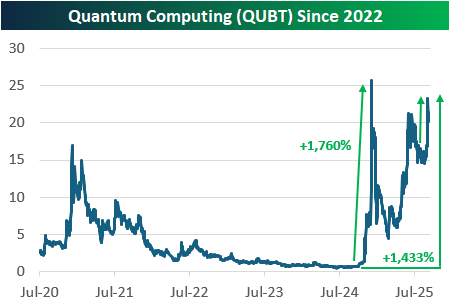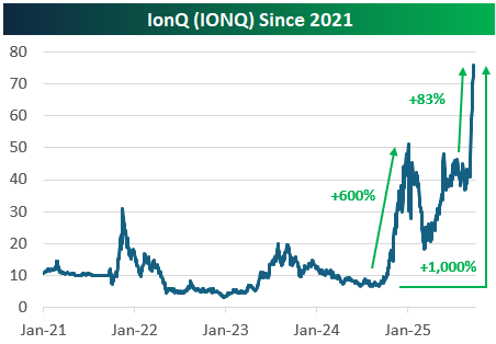 [td]Quantum Stocks SurgeQuantum computing stocks have had another parabolic run recently. There are now four "quantum" stocks with market caps in the billions, and we provide recent price charts of them below. IonQ (IONQ) is up the least of the bunch with a gain of 1,000% since its lows late last year. Quantum Computing (QUBT) is up the 3rd most with a gain of 1,433%, while Rigetti (RGTI) and D-Wave Quantum (QBTS) are both up more than 2,400%. |
