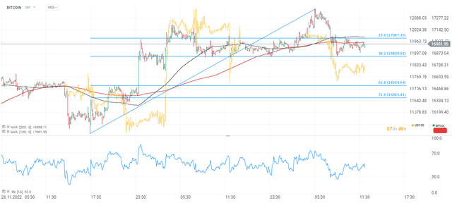 Bitcoin chart, M30 interval. The major cryptocurrency managed to hold the $17,000 level despite yesterday's dynamic sell-off, during which supply quickly pushed the bulls on the defensive and prevented it from reaching the $17,500 level. We also see that bitcoin continues to correlate with the NASDAQ index (yellow chart). Yesterday's declines on the indexes translated into sentiment in the cryptocurrency industry. As a result, Bitcoin has again slipped below the 200-session average (red line), and the next closest support is the levels at $16,800, where the 38.2 Fibonacci abolition of the upward wave that began in late November is located.​