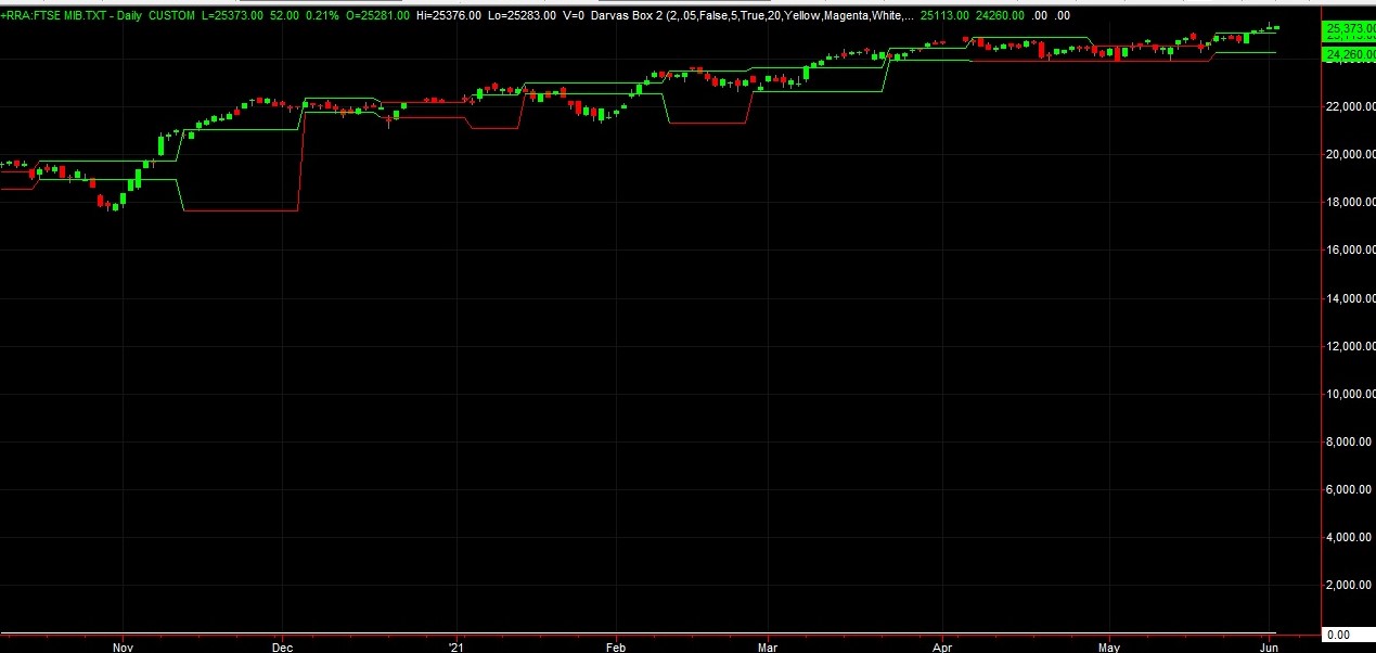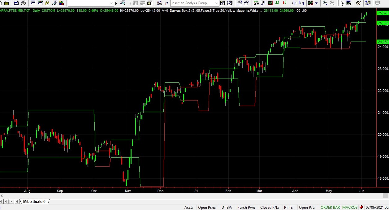After spotting the range, he would cable his broker with a buy order just above the top of the trading range and a stop-loss order just below the bottom of the range. Once in a position, he trailed his stop based on the action in the stock. In his experience, boxes often "piled up", which meant that they formed new box patterns as a stock climbed higher. Each time a new box formation was completed, Darvas raised his stop to a fraction below the new bottom of the new trading range.